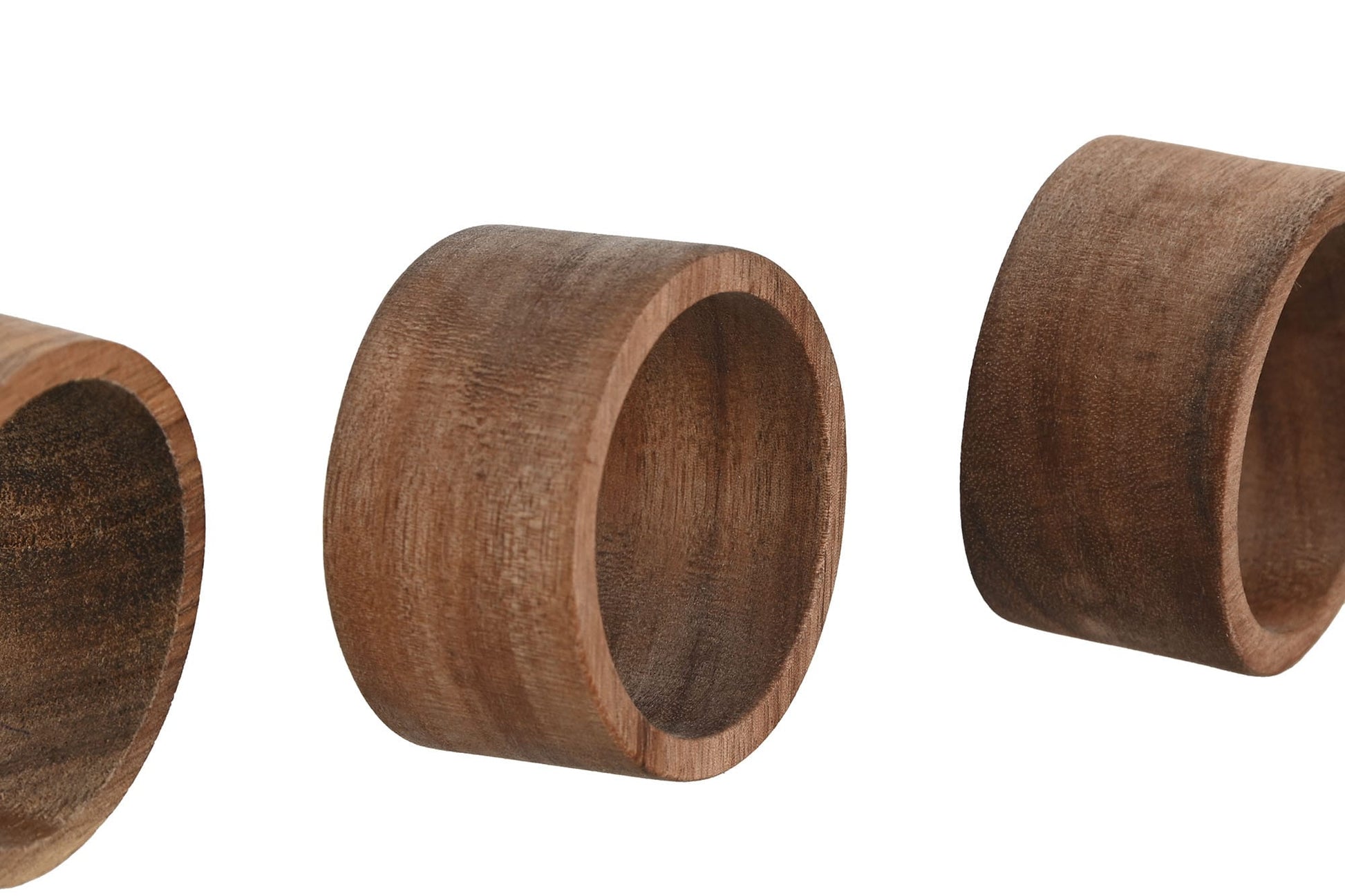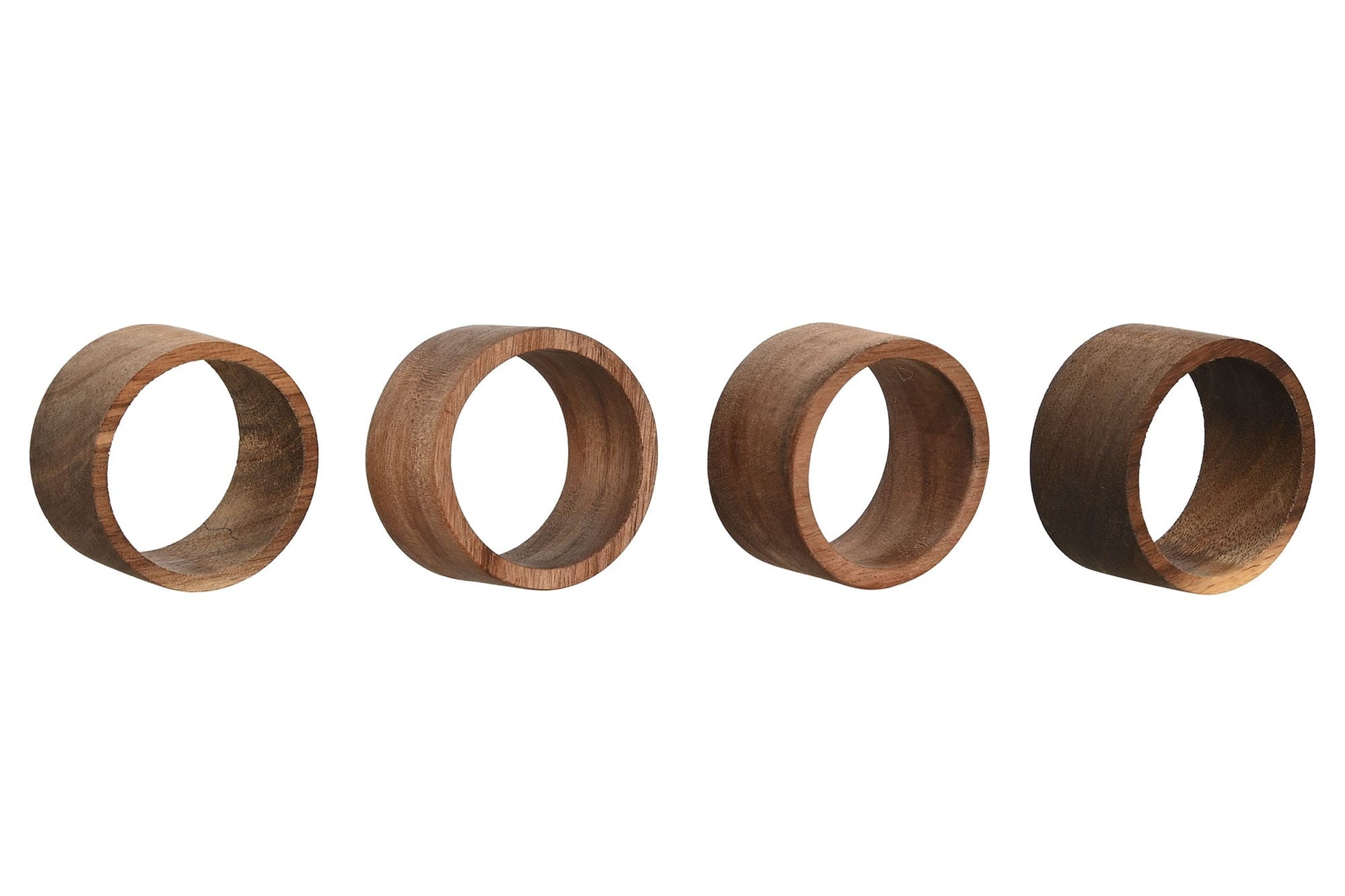 Set de 4 arandelas de servilletas elaboradas de madera de acacia, su forma circular y acabado liso realzan la presentación de la mesa, aportando un toque rústico y elegante.