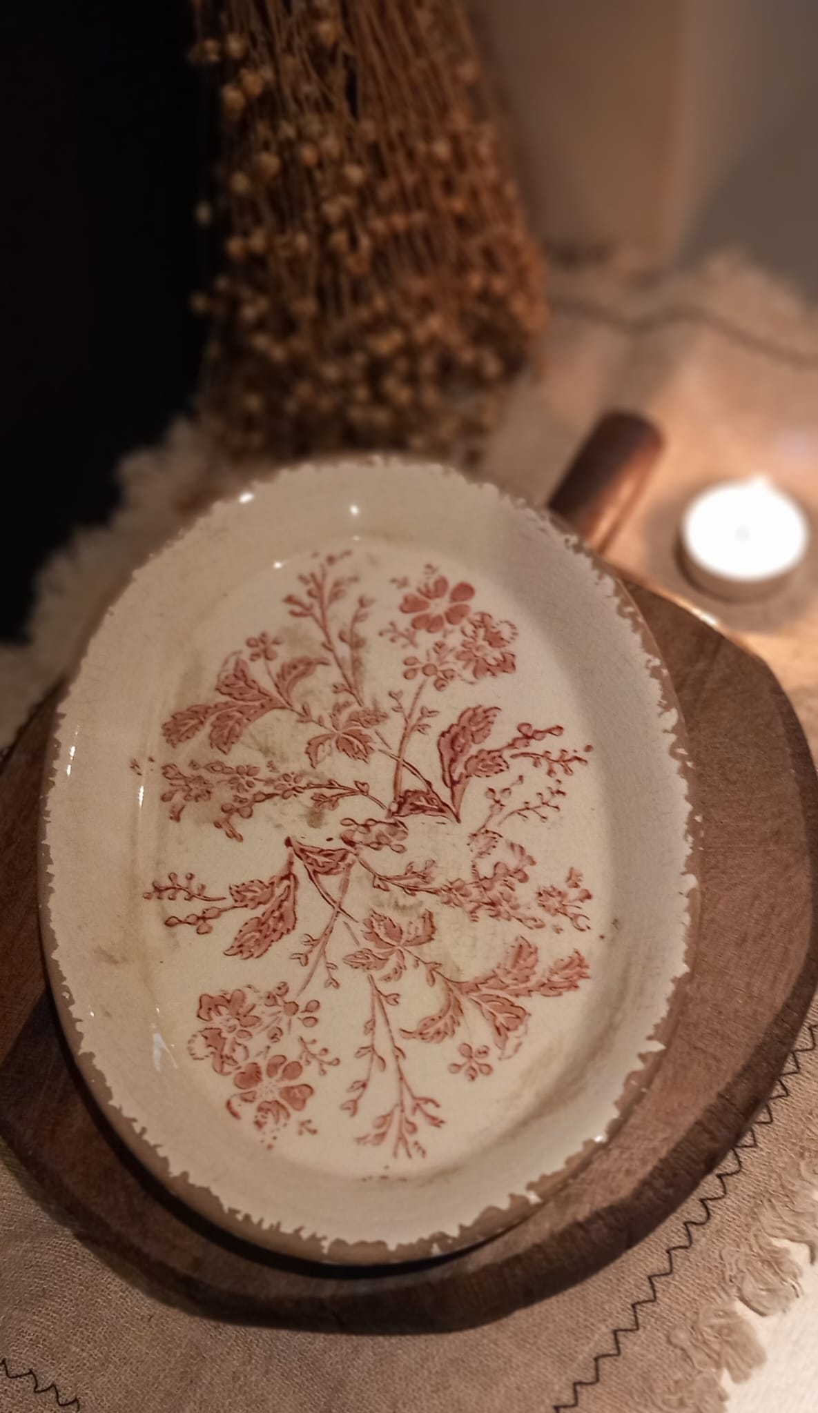 Bandeja decorativa rústica de cerámica con diseño floral en tonos burdeos y bordes desgastados, ideal para un toque vintage en tu hogar. ¡Con Annes Home , el encanto está en los detalles!