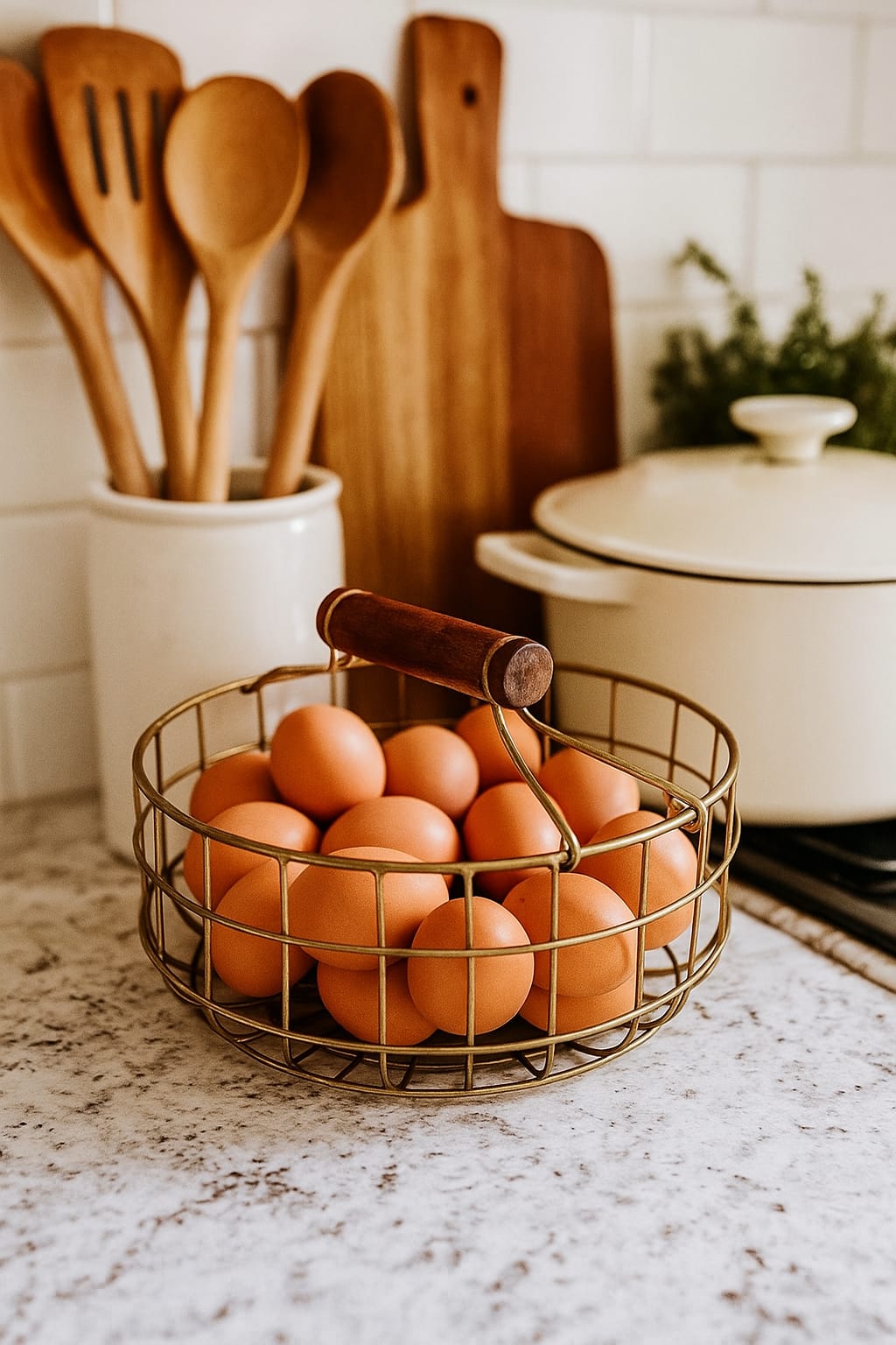 Cesta redonda de Annes Home de metal dorado con diseño minimalista y asa de madera, ideal para organizar y decorar cualquier espacio. Perfecta para aportar un toque elegante y funcional a tu hogar.