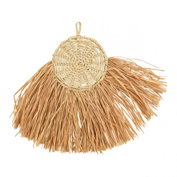 Colgador pared con diseño de círculo central tejido con rafia, del que se desprenden fibras largas y sueltas que cuelgan alrededor de la mitad inferior. Es un objeto decorativo sencillo pero elegante, ideal para dar un toque natural y artesanal de Annes Home .
