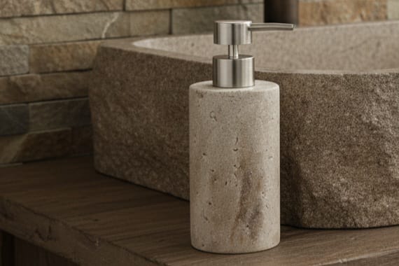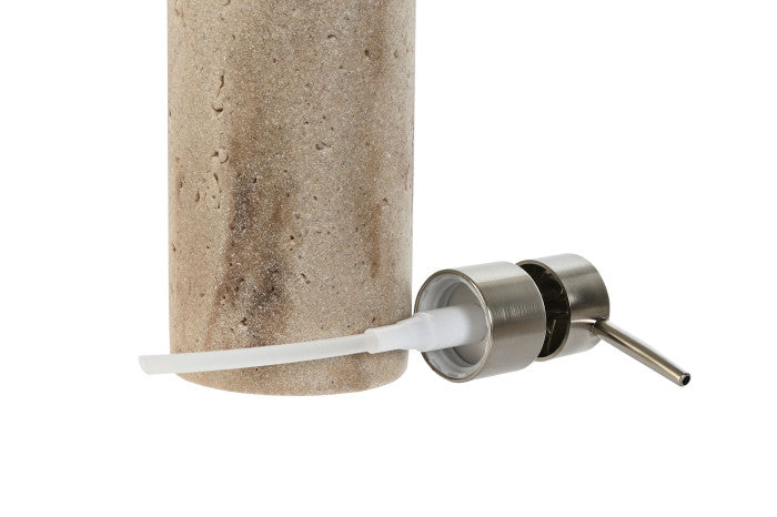 Dosificador de jabón, elaborado en mármol de color crema. Su diseño elegante y texturizado aporta un toque natural y lujoso, complementado con un dispensador metálico en acabado mate. Ideal para tu baño, este accesorio combina perfectamente con decoraciones modernas o clásicas. ¡Añade un detalle exclusivo a tu baño con Annes Home!