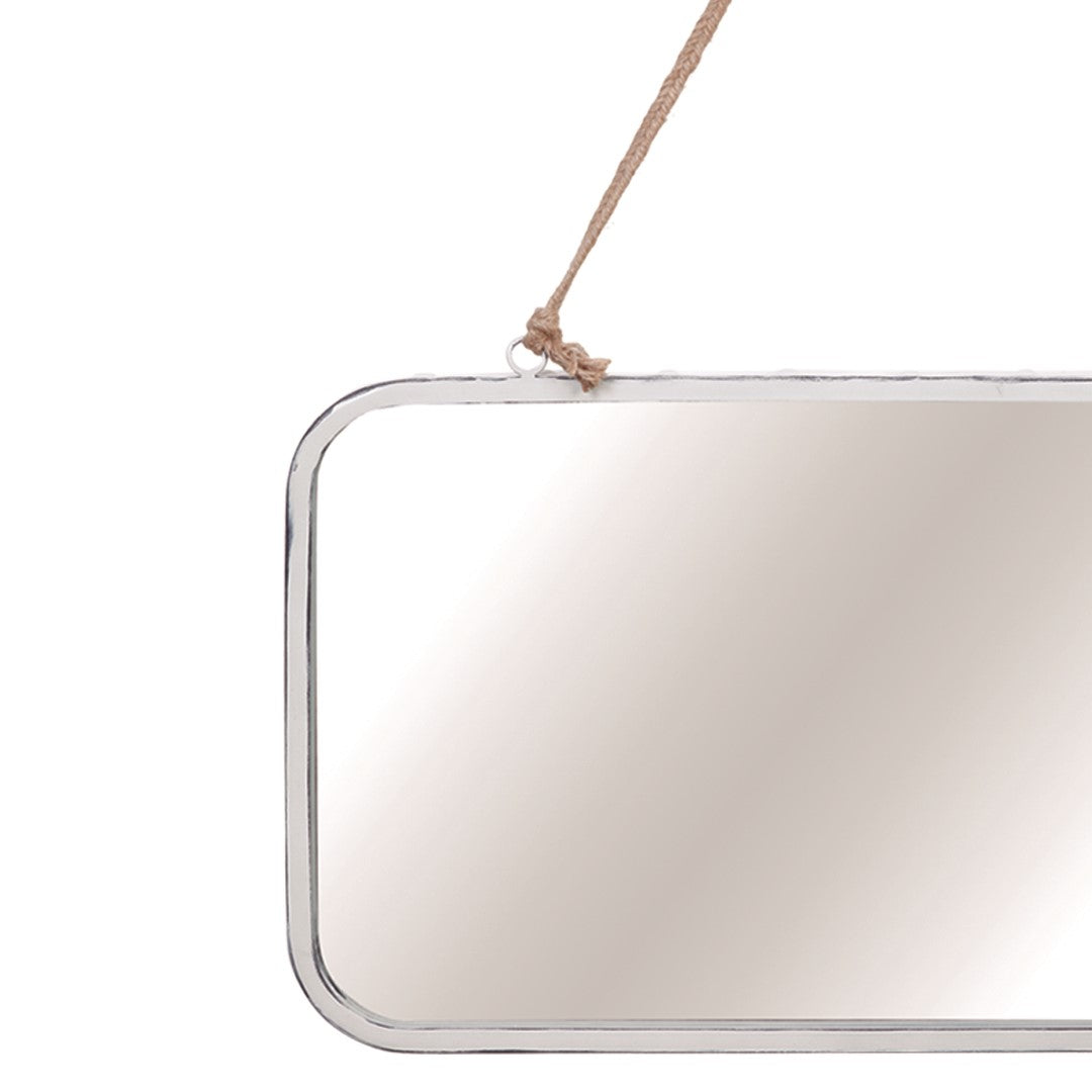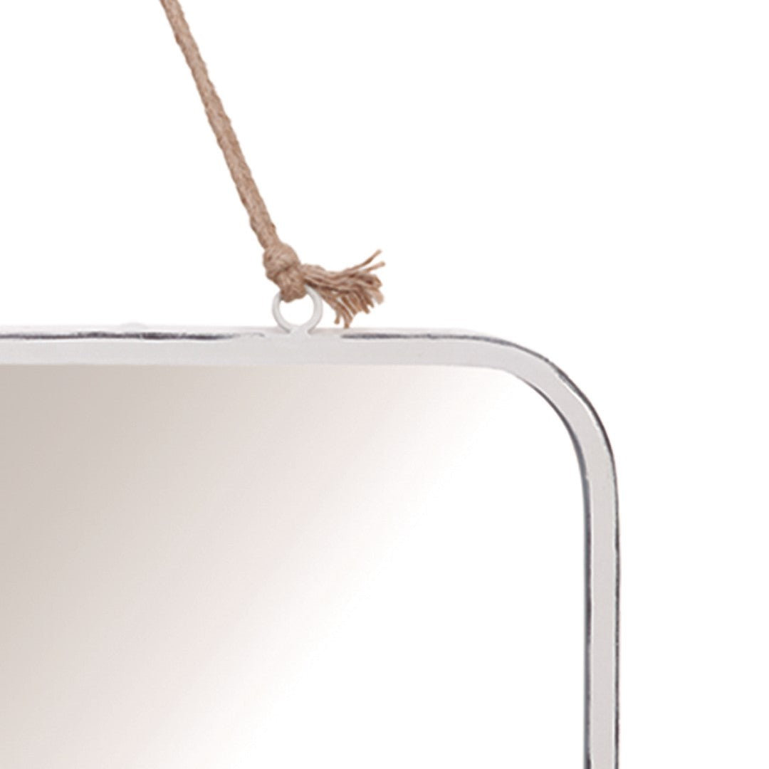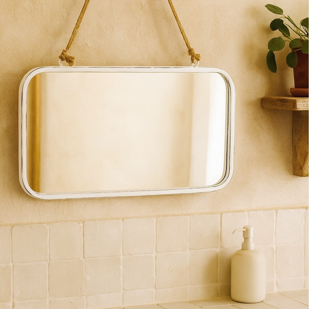 Espejo rectangular de hierro con acabado blanco envejecido, colgado mediante una cuerda de yute para un estilo rústico y vintage de Annes Home.