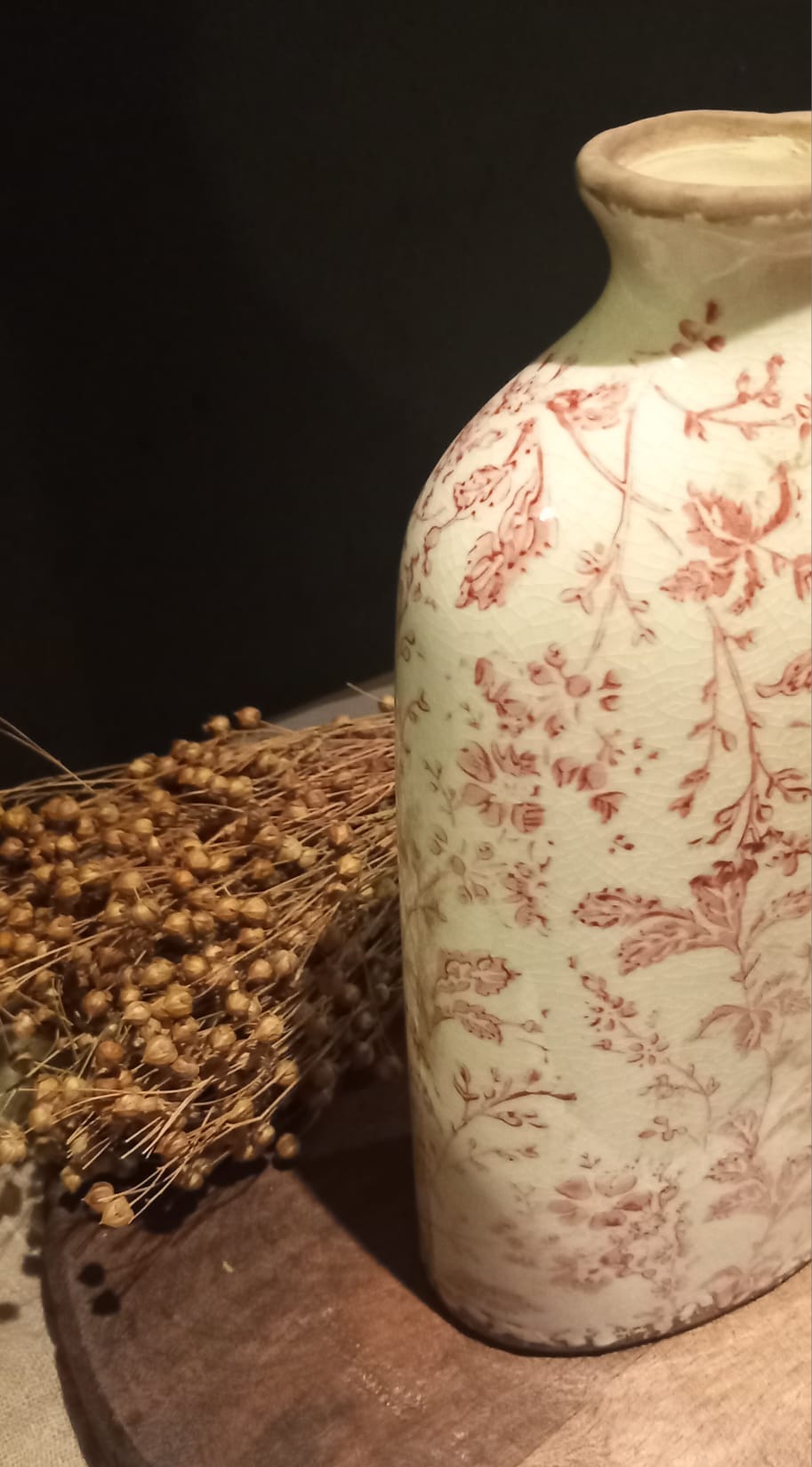 Jarrón rústico de cerámica ovalado de Annes Home con diseño floral en tonos burdeos. Ideal para agregar un toque campestre y elegante a cualquier espacio. Perfecto para flores secas o como pieza decorativa en cualquier rincón de tu hogar.