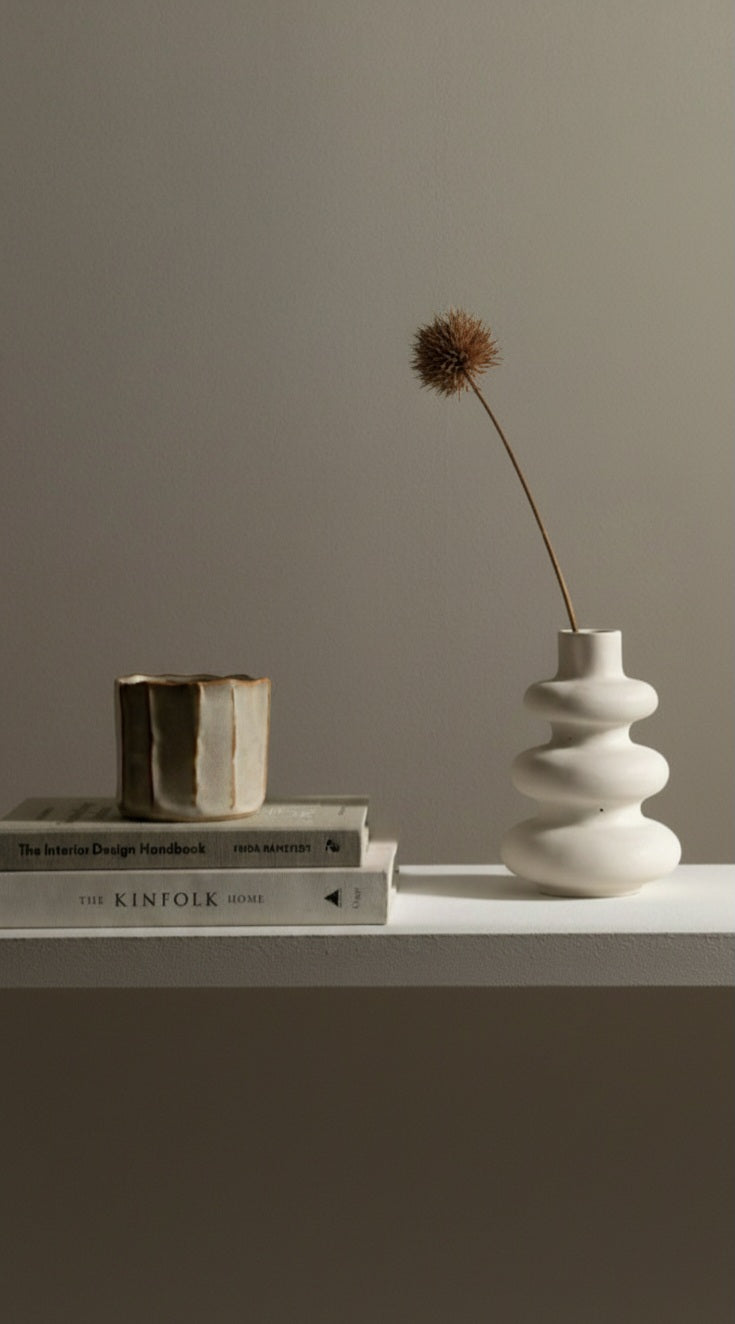 Jarrón pequeño realizado en piedra con acabado texturizado de ondas que aporta un toque artesanal a cualquier espacio.