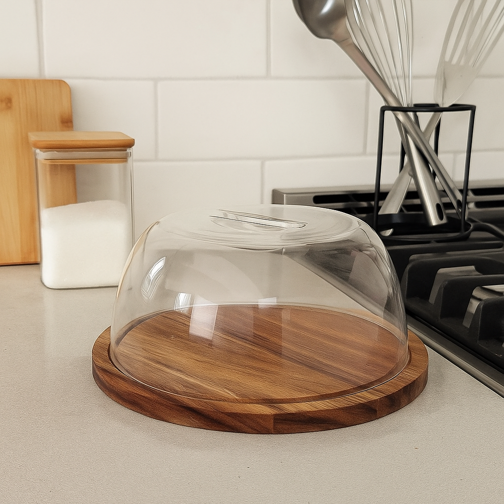 Quesera redonda de Annes Home con base de madera de acacia y tapa de material acrílico. Perfecta para guardar los quesos o presentarlos en la mesa.