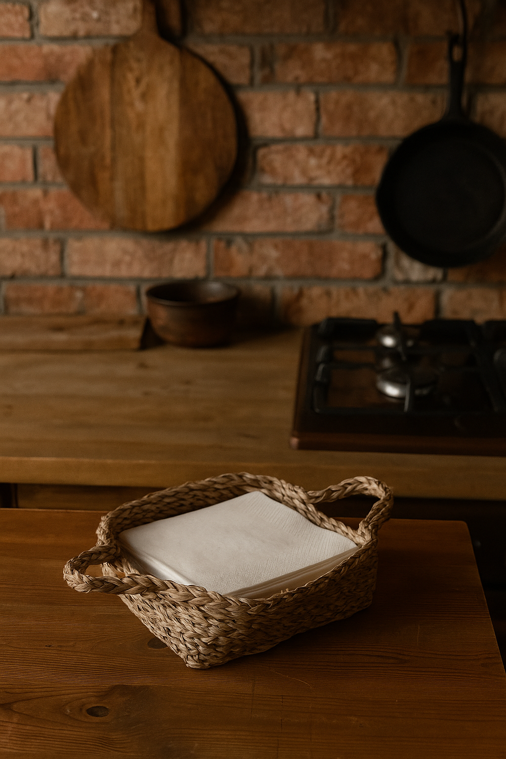 Servilletero hecho de fibras naturales de algas, tejido de manera artesanal. Tiene una forma rectangular y cuenta con asas en ambos lados, lo que le da un aspecto rústico y funcional, ideal para dar un toque natural a tu mesa, de Anne´s Home.