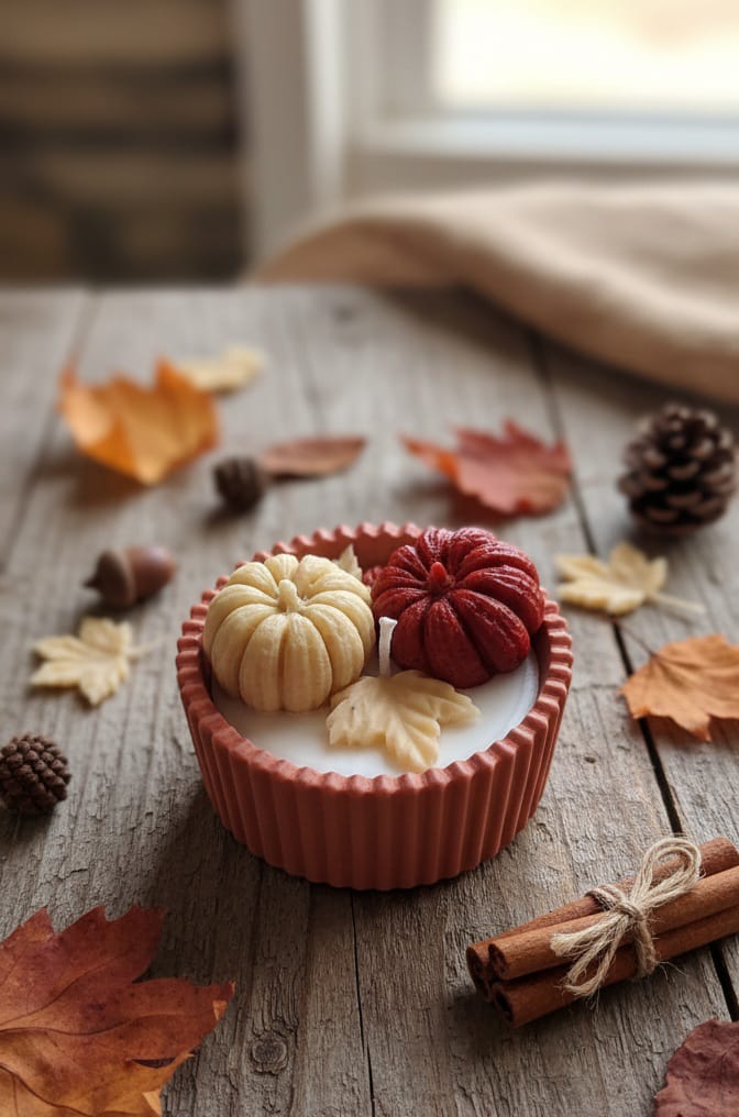 Vela de Annes Home elaborada con cera vegetal y decorada a mano con detalles otoñales, como pequeñas calabazas y unas hojas en relieve. Su fragancia suave a manzana aporta un aroma cálido y acogedor, viene en un recipiente estilo rústico color cobrizo.